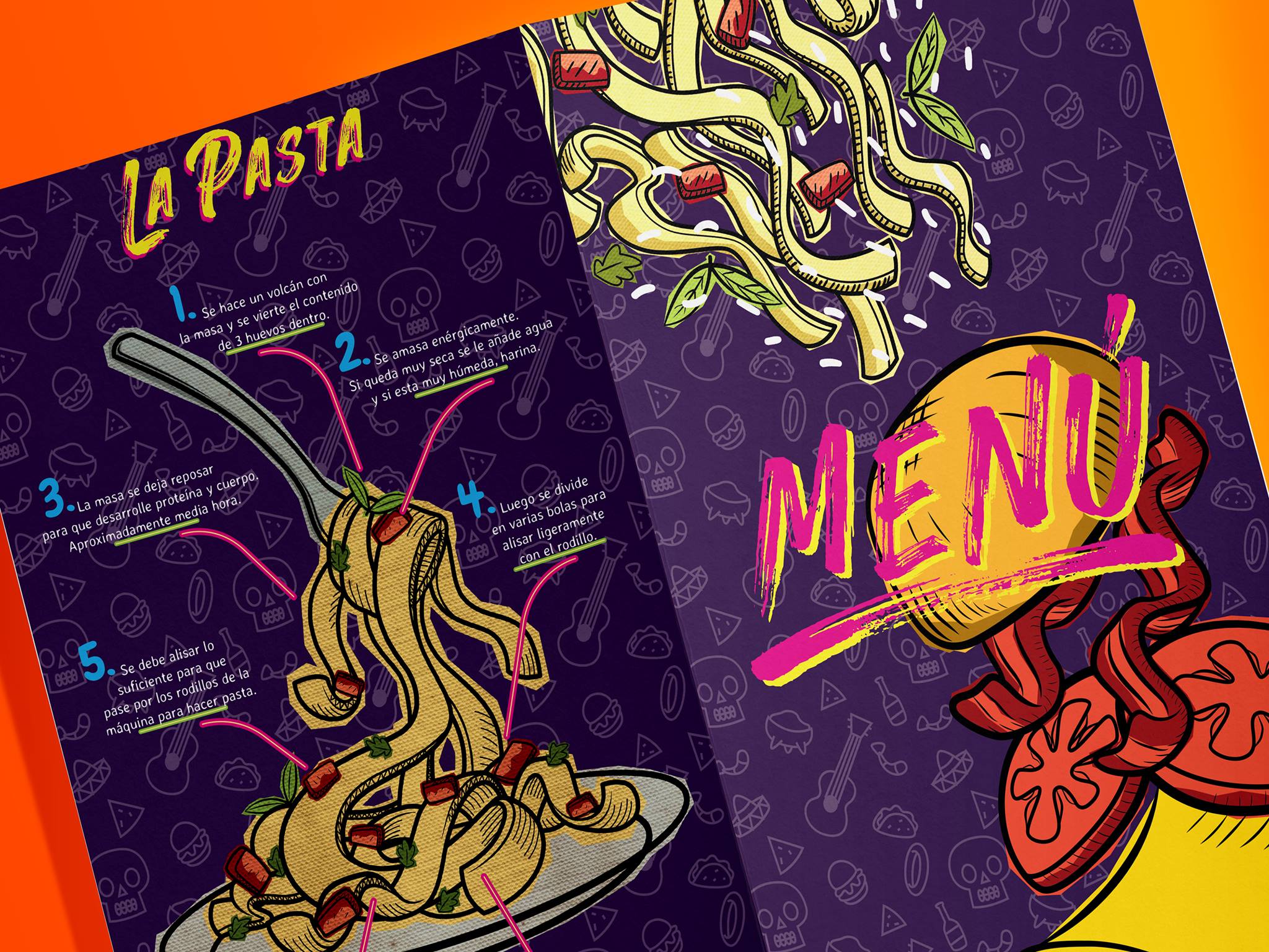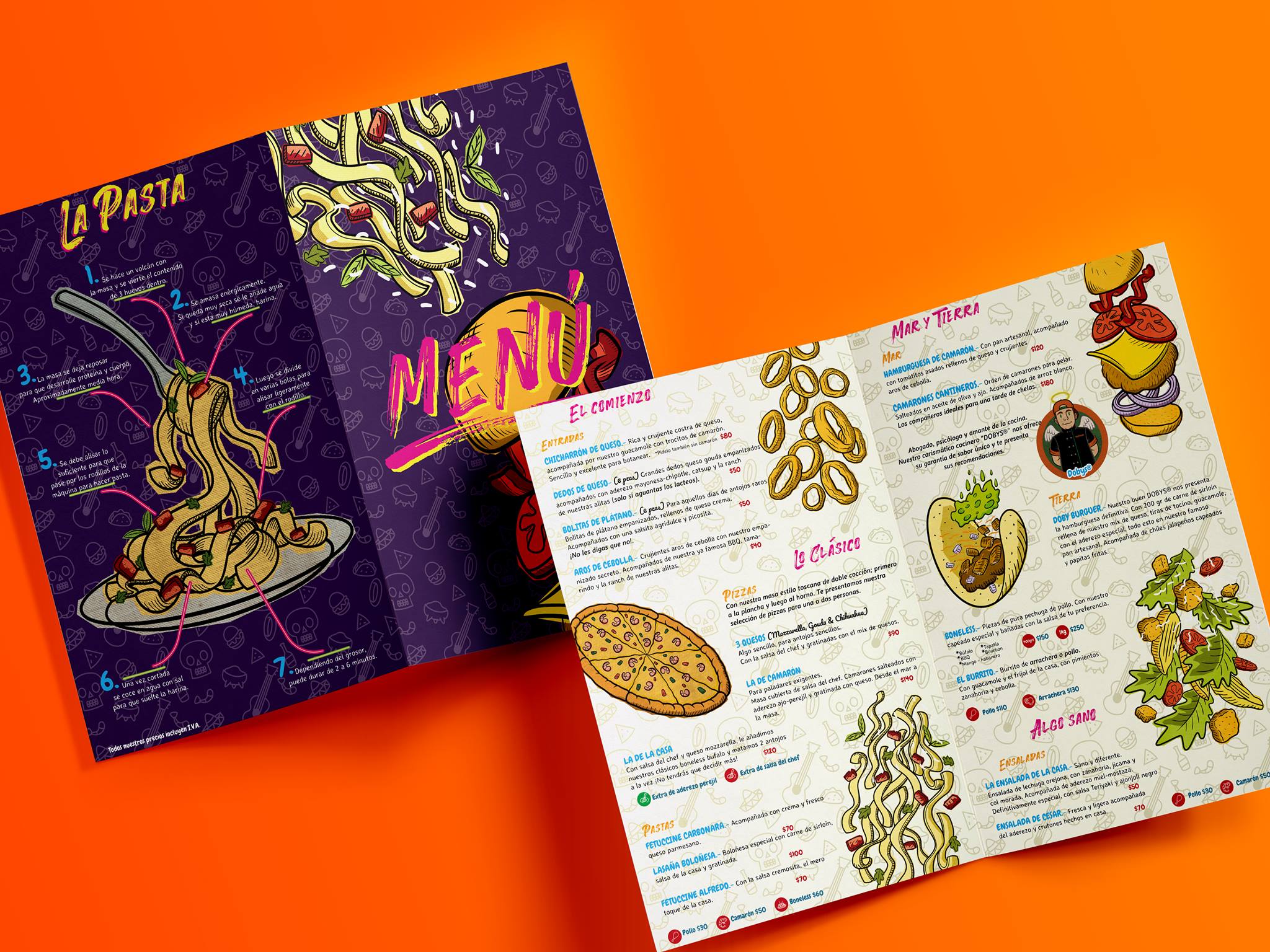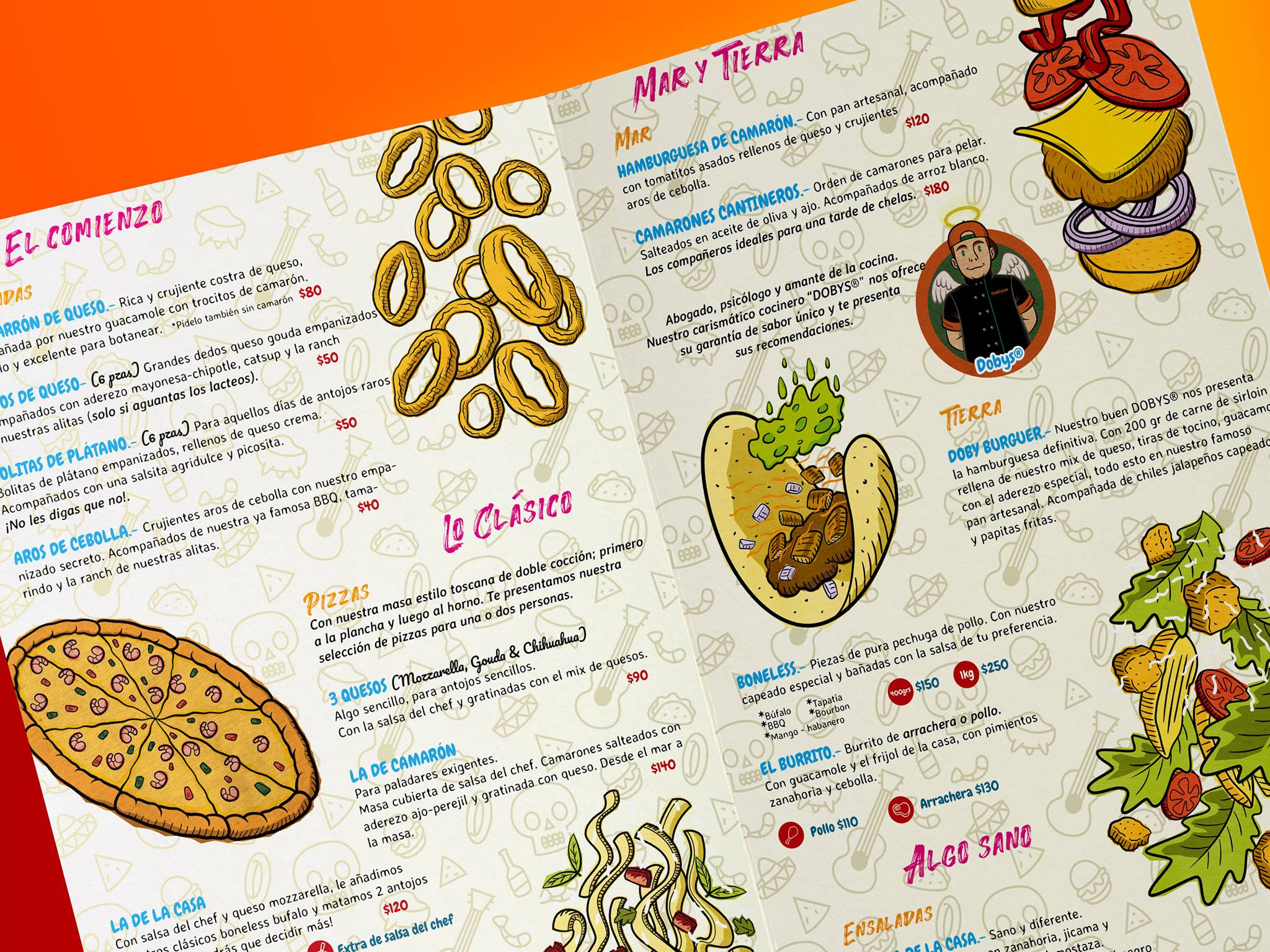 Teníamos la encomienda de realizar un menú fuera de lo común como prueba piloto para Guanatos, decidimos hacerlo totalmente ilustrado en un estilo de caricatura, invitando a leerlo y disfrutar incluso antes de ordenar.